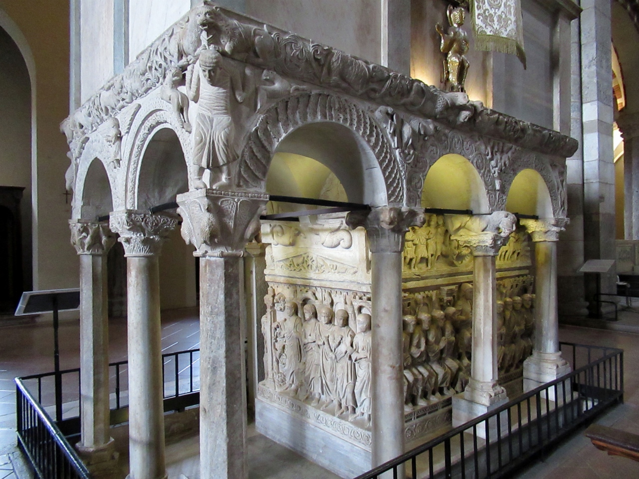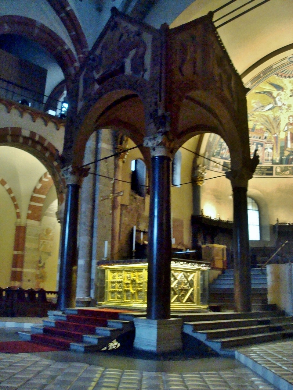 Poco più avanti troneggia l’ambone medievale con il sottostante sarcofago paleocristiano detto di Stilicone (sec. IV), generale e console romano di origine vandala che la credenza popolare vuole sia sepolto in questo luogo. Procedendo si possono ammirare il solenne ciborio di epoca carolingia (sec. IX), lo splendido mosaico del catino absidale (sec. XIII), la cripta settecentesca con i corpi dei santi Ambrogio, Protasio e Gervasio custoditi negli abiti pontificali in un’urna d’argento del XIX secolo.