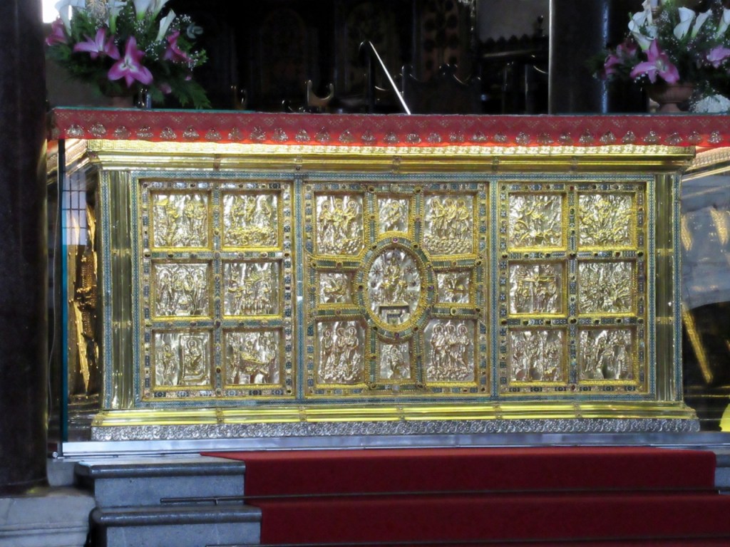Nelle varie formelle di lamine d’oro, cesellate e divise da fasce di smalti e gemme, sono raffigurati episodi della vita di Cristo e storie di quella del santo titolare, dagli anni dell’infanzia (miracolo delle api) a quelli delle sue funzioni civili, politiche e religiose.