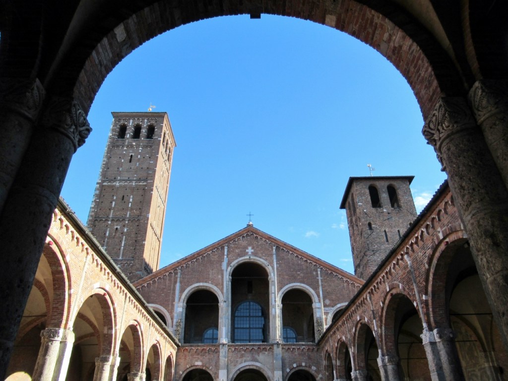 Eppure, nella città detta “ambrosiana”, sarebbe forse più logico e significativo cominciare dalla basilica intitolata al santo patrono, non fosse altro che per il fatto di essere sorta tra il 379 e il 386, ovvero esattamente mille anni prima del Duomo, e poi perché le sue architetture romanico lombarde accoglienti ed essenziali dicono molto di Milano e dei suoi abitanti. Al racconto contribuisce naturalmente la figura stessa del suo fondatore Ambrogio, funzionario imperiale di origini tedesche che rifiutò fino all’ultimo la nomina a vescovo per poi diventarlo con profonda dedizione civile e spirituale. Tra gli episodi della sua vita c’è anche quello della conversione e battesimo di Agostino da Ippona, il futuro Sant’Agostino, venuto dal Nordafrica a Milano per esercitare l’insegnamento. Pensate un po’ che storia emblematica e moderna (e che via vai): un funzionario laico nato in Germania e formatosi a Roma che divenuto vescovo di Milano converte e battezza un immigrato nordafricano.