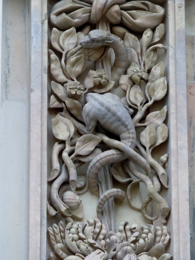 Lo stemma dei Visconti, singolarmente o unito a quello degli Sforza, lo ritroviamo un po’ ovunque, a partire naturalmente dal Castello Sforzesco. Quanto al drago Tarantasio che l’ispirò, lo si trova anch’esso in giro per la città, ma più raramente e quasi in incognito, così diventa persino stimolante cercarlo dove non si penserebbe mai: come tra le colonne del Palazzo della Ragione, su una finestra della chiesa di San Marco, o nei doccioni del Duomo e addirittura sul suo portale centrale.
