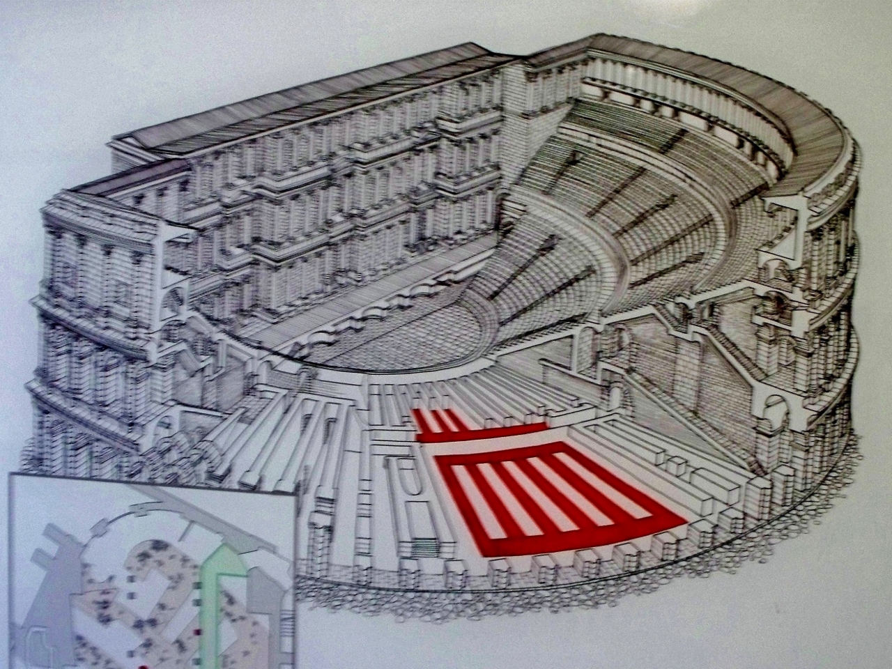 Il teatro romano sorse infatti sul finire del I secolo a.C., in piena età augustea, ed era situato nell’area compresa tra le odierne via Meravigli e Piazza degli Affari. Alto 20 metri e con un diametro di 95 poteva ospitare nei due ordini di gradinate circa 8000 spettatori, cifra davvero enorme e non solo per quei tempi, tanto più se si pensa che allora la città contava non più di 18.000 abitanti.