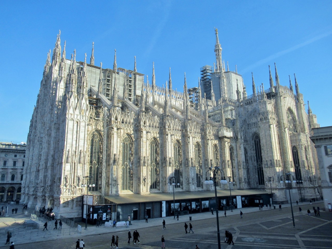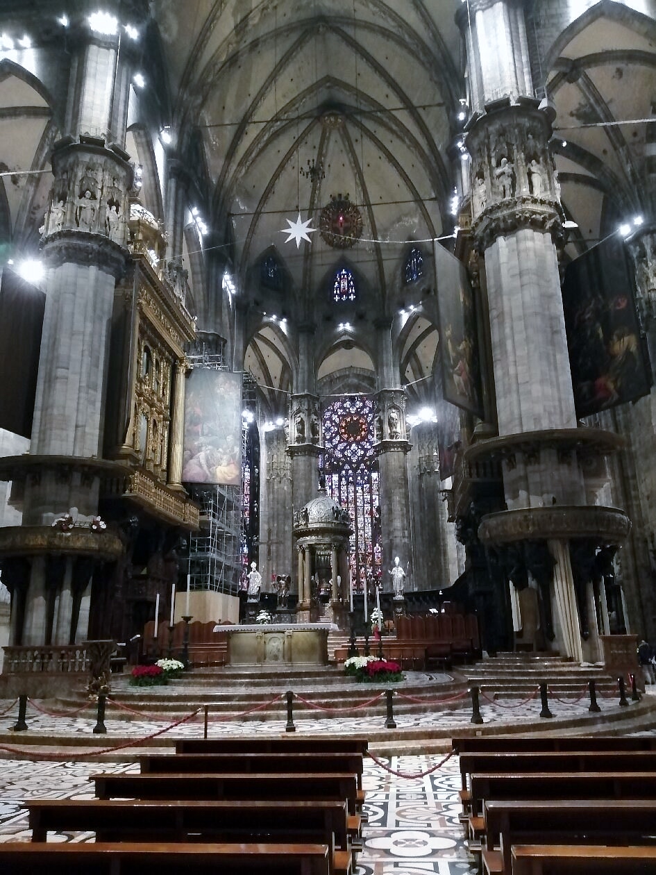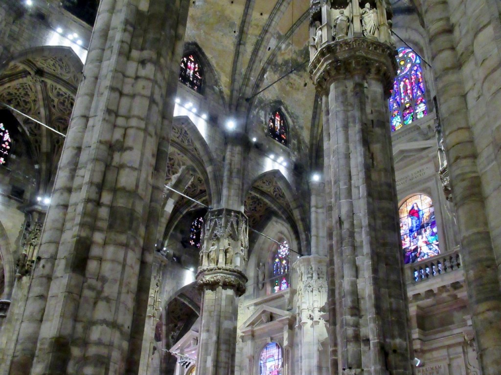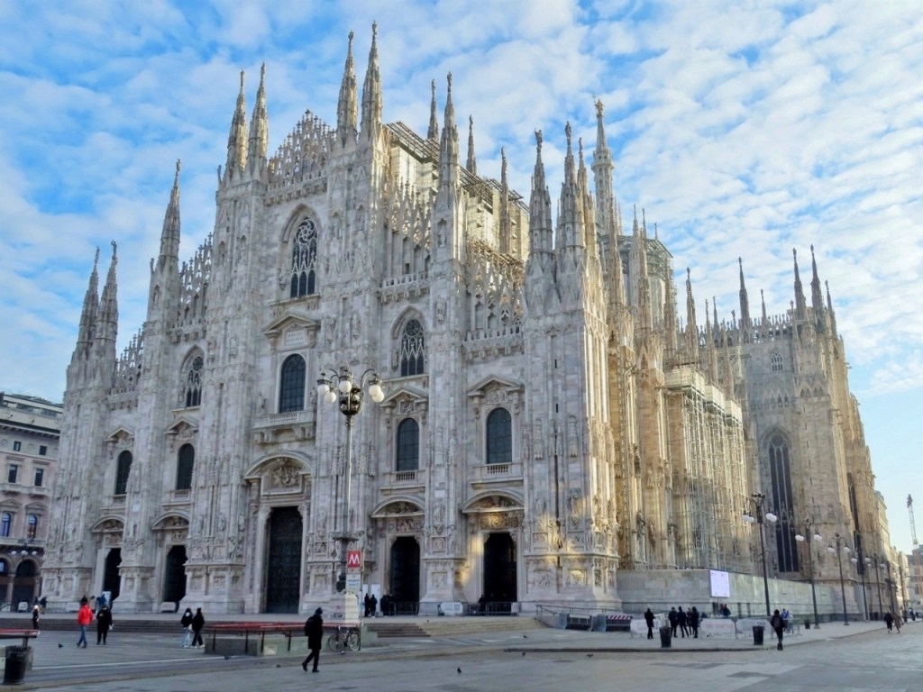 Tralasciamo, per quanto sbalorditivi, i dati statistici sulle sue eccezionali dimensioni e la descrizione dei complessi particolari architettonici, sottolineando però le 135 guglie, le oltre 3400 statue a figura intera, esclusi gli altorilievi e i giganti dei doccioni, i cinque magnifici portoni in bronzo, i colossali pilastri interni (52 come le settimane dell’anno), le 55 vetrate policrome che abbracciano un arco temporale di quasi seicento anni a partire dalla più antica di inizio Quattrocento, per tacere delle innumerevoli opere d’arte custodite nelle cinque navate. Giunti dunque al suo cospetto – la visuale migliore si ha dal palazzo dell’Arengario – affiora un moto di meraviglia, che non farà che aumentare girando tutt’intorno per ammirare gli infiniti dettagli.