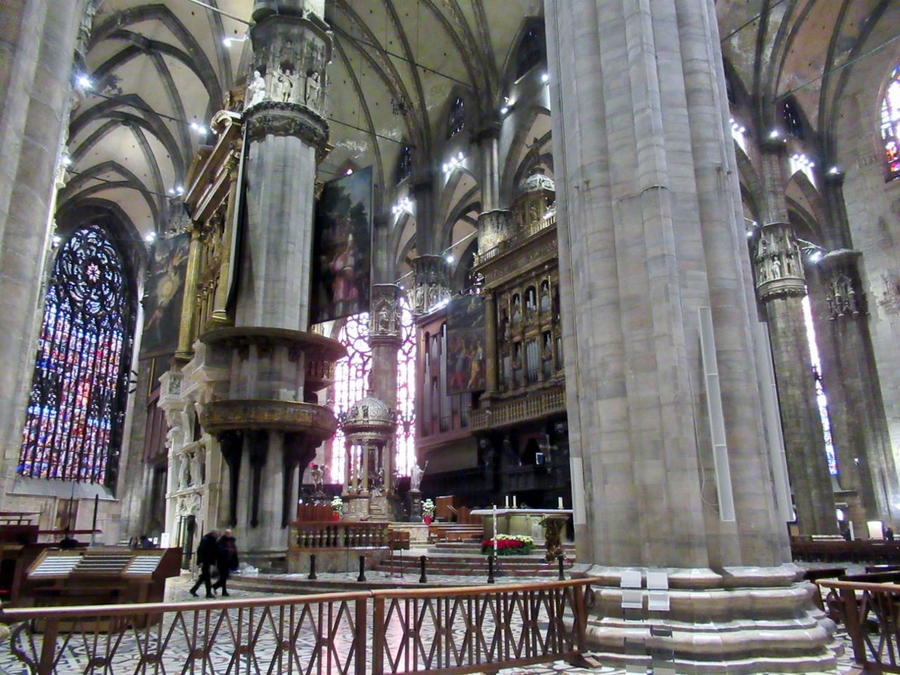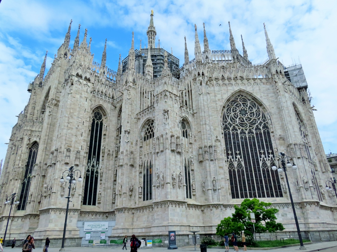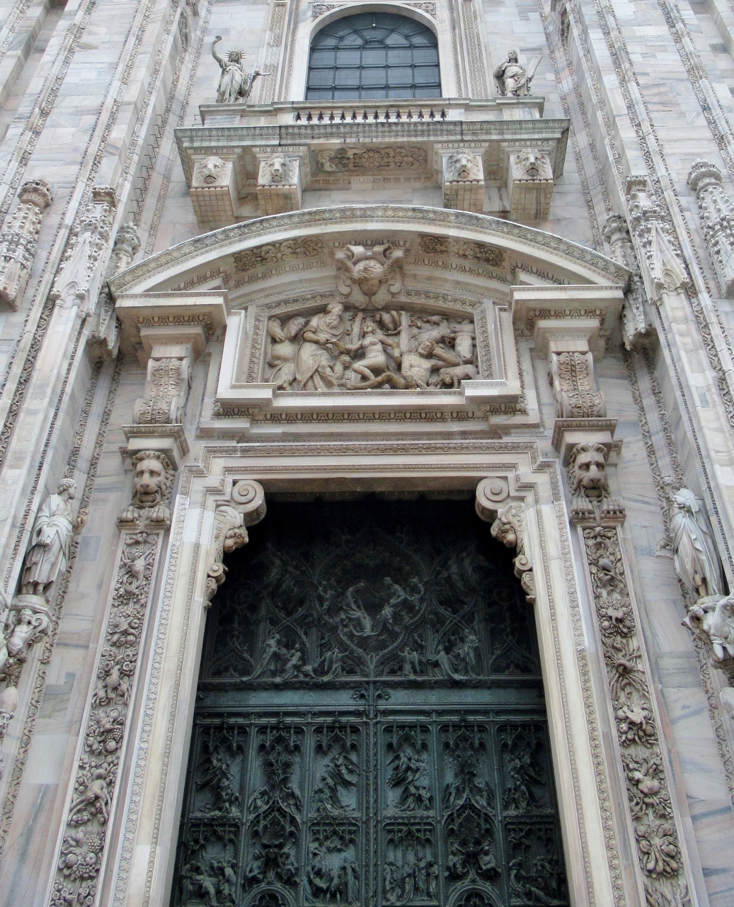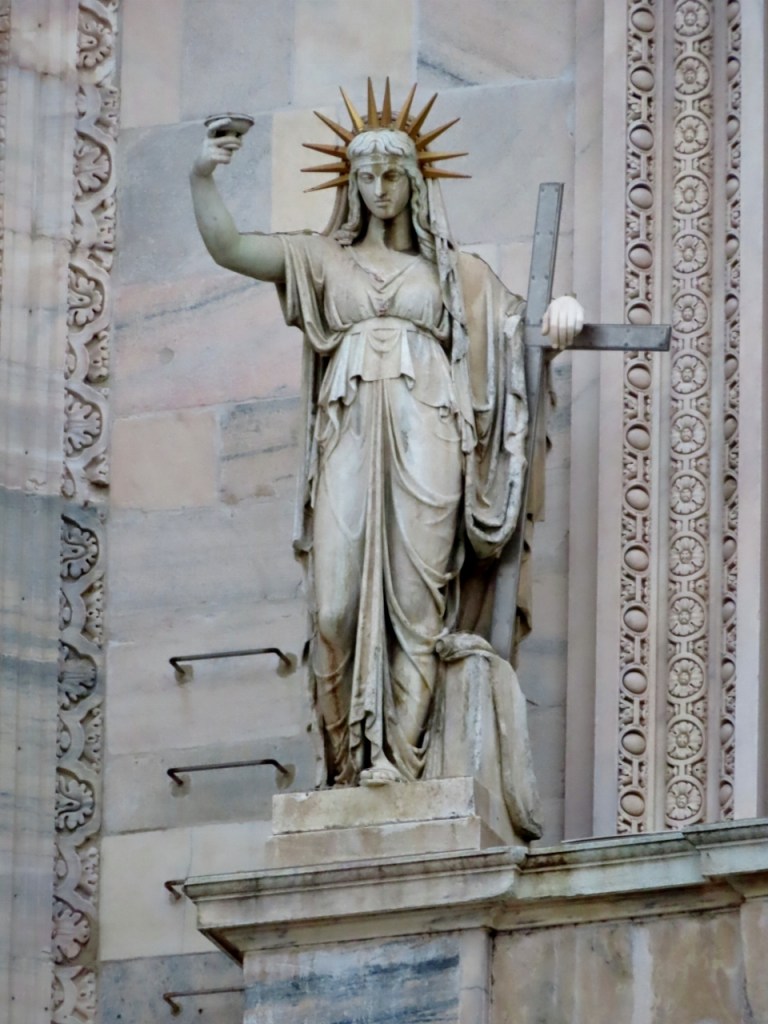 Tralasciamo, per quanto sbalorditivi, i dati statistici sulle sue eccezionali dimensioni e la descrizione dei complessi particolari architettonici, sottolineando però le 135 guglie, le oltre 3400 statue a figura intera, esclusi gli altorilievi e i giganti dei doccioni, i cinque magnifici portoni in bronzo, i colossali pilastri interni (52 come le settimane dell’anno), le 55 vetrate policrome che abbracciano un arco temporale di quasi seicento anni a partire dalla più antica di inizio Quattrocento, per tacere delle innumerevoli opere d’arte custodite nelle cinque navate. Giunti dunque al suo cospetto – la visuale migliore si ha dal palazzo dell’Arengario – affiora un moto di meraviglia, che non farà che aumentare girando tutt’intorno per ammirare gli infiniti dettagli.