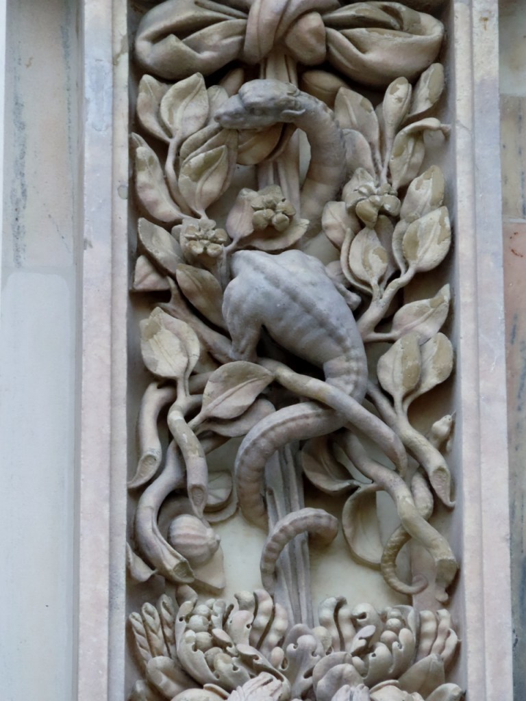 Tra le decorazioni del portale maggiore, ad esempio, si riconosce in alto a destra il mitico drago Tarantasio, feroce mostro che abitava il misterioso lago Gerundo, vasto acquitrino situato a sudest di Milano, dove s’appostava per divorare viandanti e bambini. Fino a quando un coraggioso cavaliere, Uberto Visconti, lo affrontò lancia in resta uccidendolo.