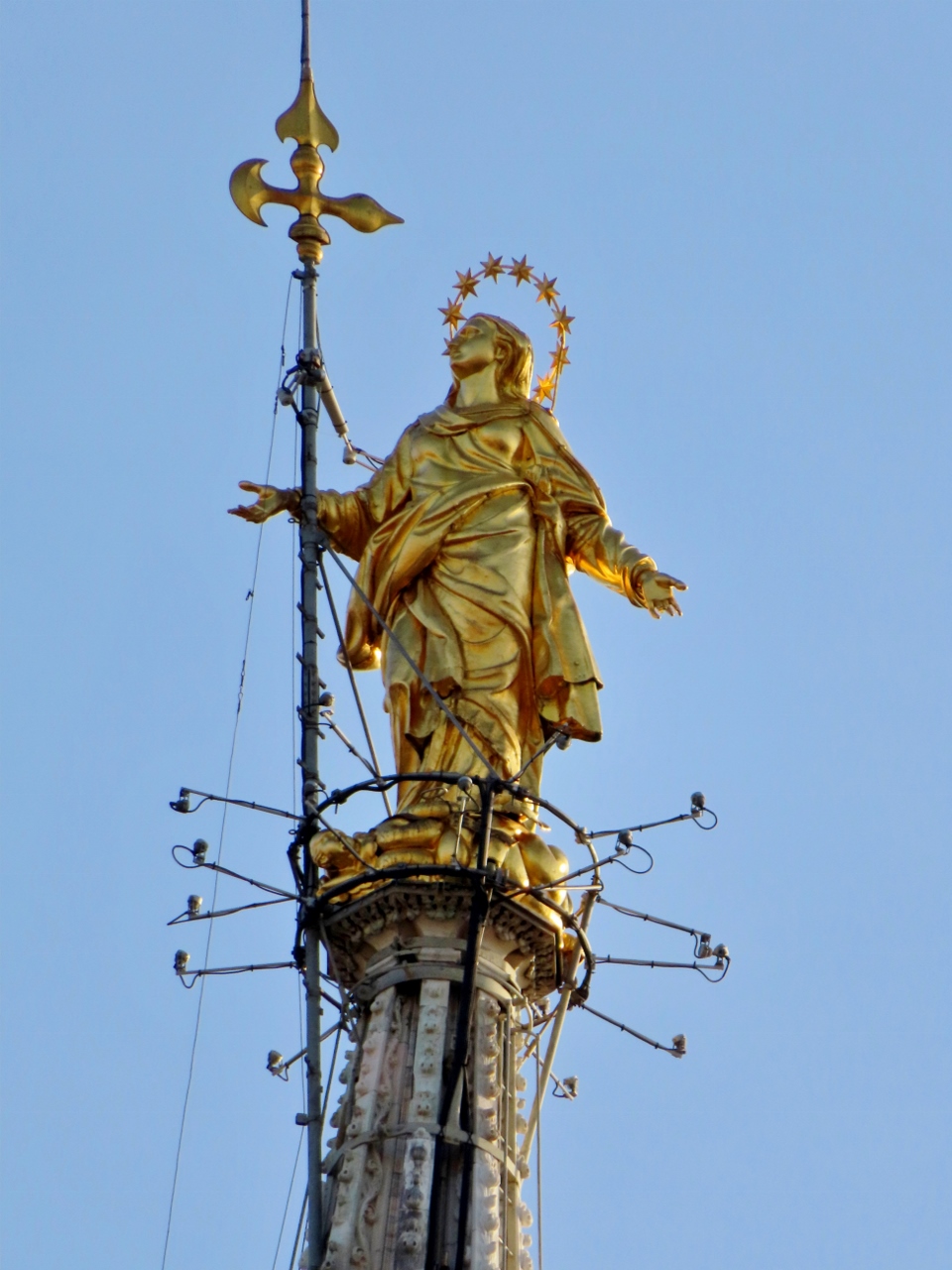 A questo punto è d’obbligo e quanto mai opportuno levare lo sguardo ancora più su, fino alla Madonnina “tuta dora e piscinina”, che poi tanto piccina non è con i suoi quattro metri abbondanti d’altezza per quasi una tonnellata di peso.