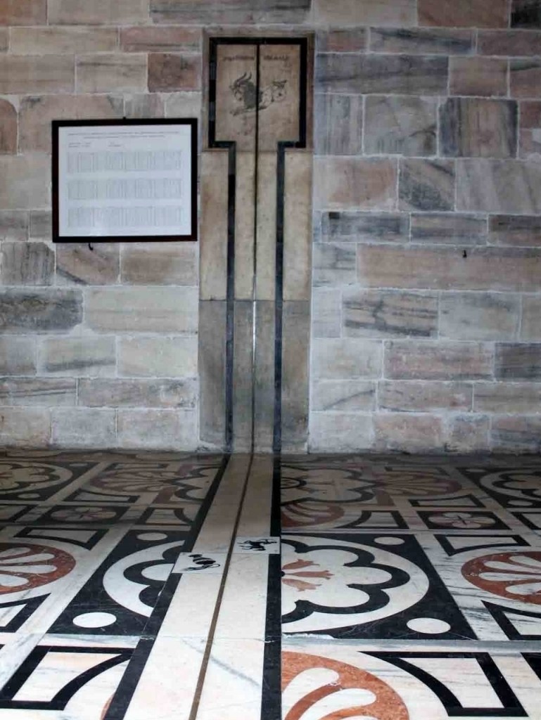 Appena superata la soglia si notano, incastonati nel pavimento e sulla parete di sinistra, una sottile striscia d’ottone con i segni zodiacali in marmo: è la meridiana astronomica, sulla quale a mezzogiorno si posa il raggio solare che penetra attraverso un piccolo foro in alto a destra.