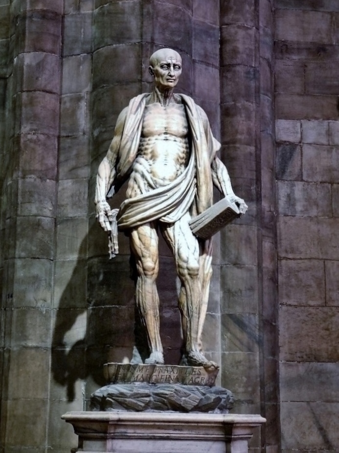 Nel transetto di destra impressiona per il crudo realismo della rappresentazione anatomica la cinquecentesca statua di San Bartolomeo scorticato, mirabile capolavoro di Marco d’Agrate, il quale, senza tema d’immodestia, con una scritta in latino sul piedistallo fa dire al santo che l’autore dell’opera non è Prassitele, come si potrebbe credere, bensì Marco d’Agrate.