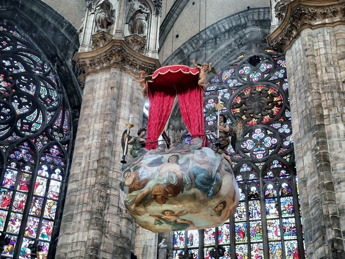 Dalla Nivola originaria, una semplice piattaforma di legno, nel 1624 si passò a quella ancora in uso oggi, voluta dall’arcivescovo Federico Borromeo, cugino e successore di Carlo, e avvolta in tele dipinte da Paolo Camillo Landriani detto il Duchino, forse ispirandosi a disegni di Giovan Battista Crespi “il Cerano”, artefice peraltro della croce in legno dorato. Con un ultimo sguardo alle navate e alle artistiche vetrate policrome ci avviamo all’uscita, lasciandoci alle spalle un ambiente veramente unico per storia e bellezza.