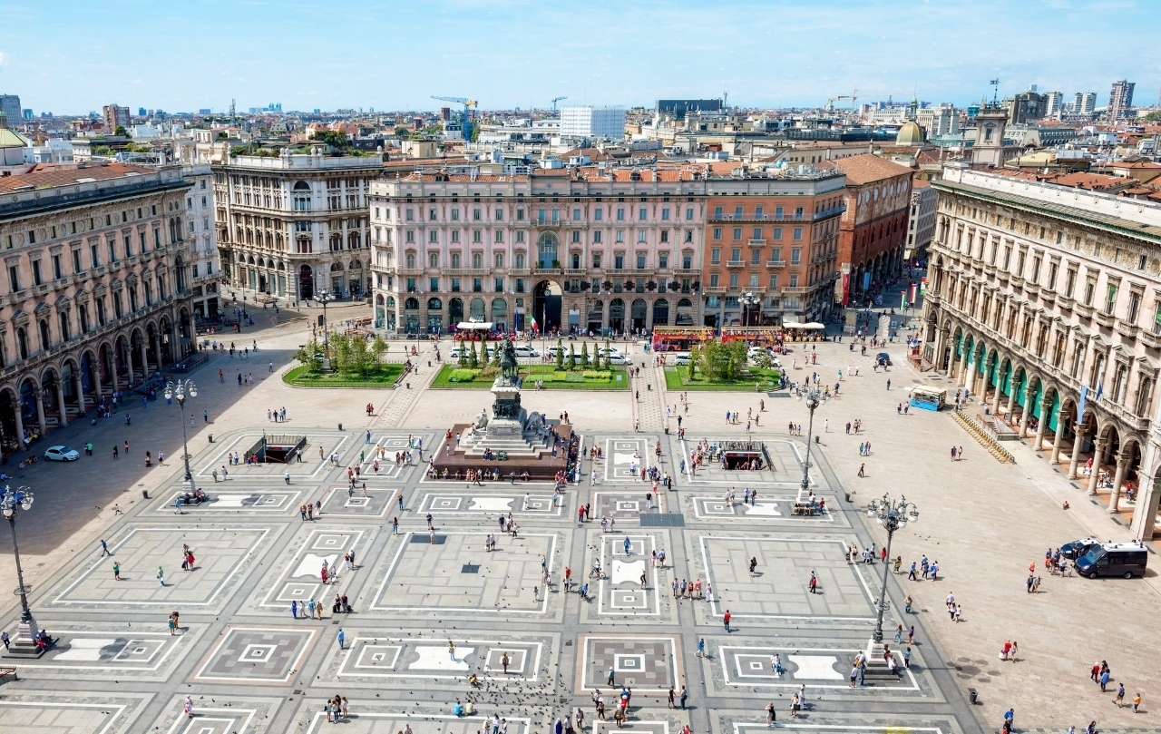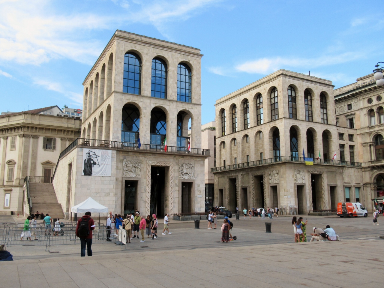 Il progetto di Giuseppe Mengoni infatti, presentato nel 1863 e rimasto incompiuto, prevedeva oltre ai palazzi realizzati lungo i lati nord e sud un analogo edificio porticato sul lato ovest, da costruire nell’area dove oggi ci sono le aiuole e le aste con le bandiere.
