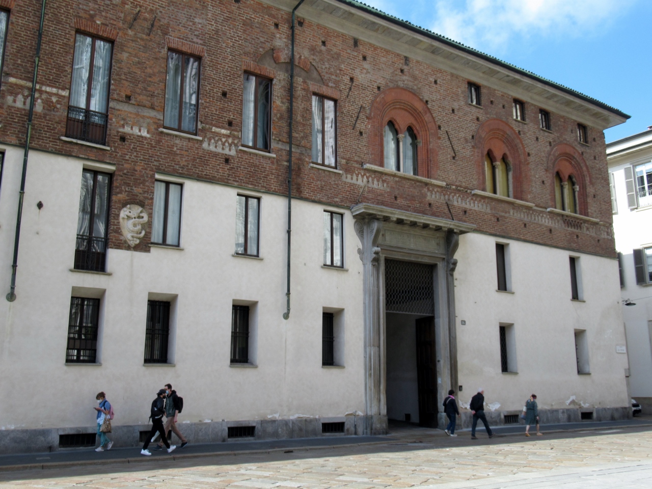 Il Palazzo della Veneranda Fabbrica del Duomo sorge alle spalle della Cattedrale ed è sede dell’antica istituzione fondata nel 1387 da Gian Galeazzo Visconti. L’elegante edificio fu realizzato nel 1841-53 da Pietro Pestagalli sull’area dell’antico Camposanto e coronato nel 1865 da Giuseppe Vandoni col fastigio e l’orologio affiancato dalle statue allegoriche del Giorno (un giovane che con la mano si ripara dal sole) e della Notte (una donna assopita).