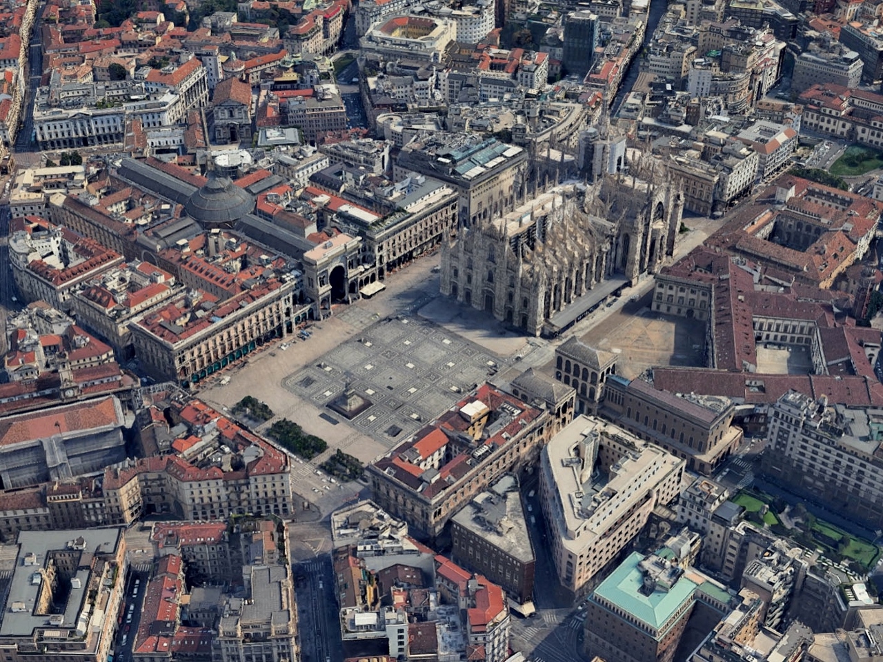 Piazza del Duomo, che ovviamente è frutto di innumerevoli trasformazioni succedutesi nei secoli, nel suo assetto attuale di enorme rettangolo dominato dalla Cattedrale, ha un’origine relativamente recente – all’incirca centosessant’anni – e per giunta, a dirla tutta, non doveva neanche essere come la vediamo oggi, bensì più corta.